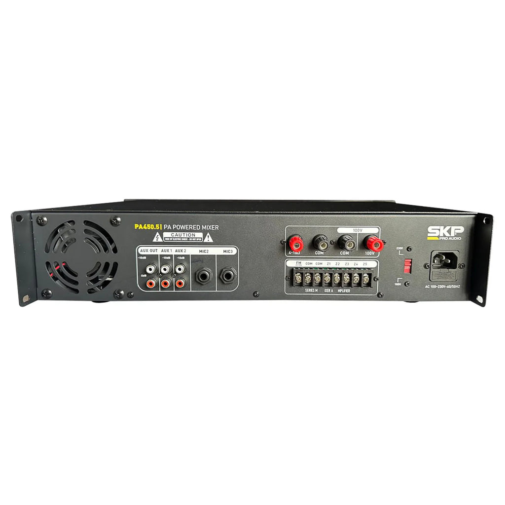 El PA 450.5 de SKP es un amplificador profesional diseñado especialmente para instalaciones de sonido en entornos comerciales y profesionales. Este amplificador compacto y resistente permite amplificar hasta 5 zonas independientes, ideal para aplicaciones en centros comerciales, auditorios, hospitales y otros espacios donde se requiere sonido ambiental o sistema de voceo.