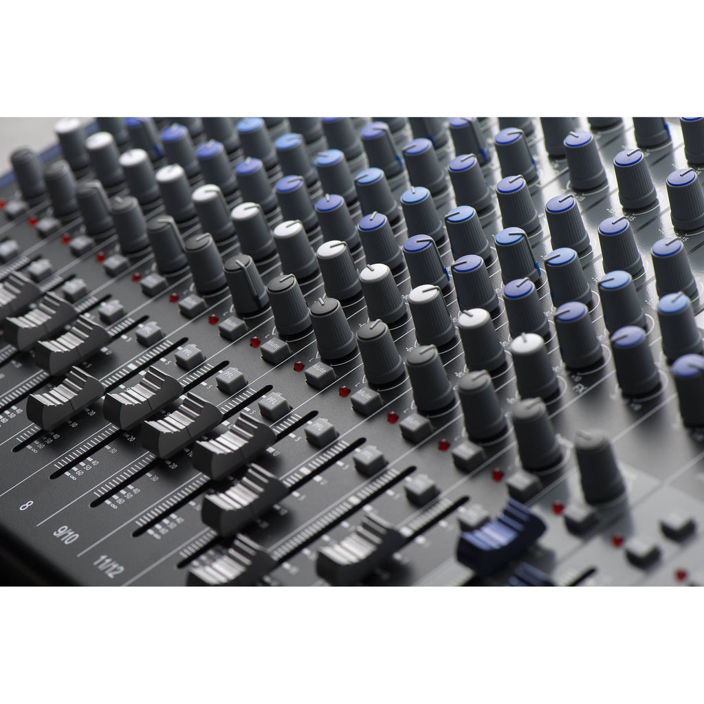 - 8 canales mono y 4 estéreo, cada uno con knob de nivel, pan, mute, PFL solo, filtro paso-alto y ecualizador semiparamétrico de 3 bandas.